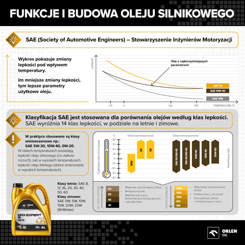 Olej widoczny na grafice reprezentuje typowy przykład oleju, który łączy stabilność pracy w cieple z dobrą płynnością przy starcie, co czyni go uniwersalnym w codziennym użytkowaniu.