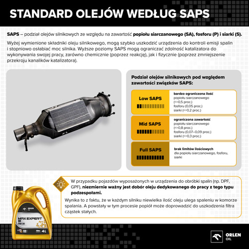 Przykładowo olej MAX Expert 5W‑30, to produkt przeznaczony do współczesnych silników, w których szczególne znaczenie ma dobór odpowiedniej klasy SAPS. Wybór takiego oleju jest elementem dbałości o kompatybilność z filtrem DPF/GPF i całym układem oczyszczania spalin.